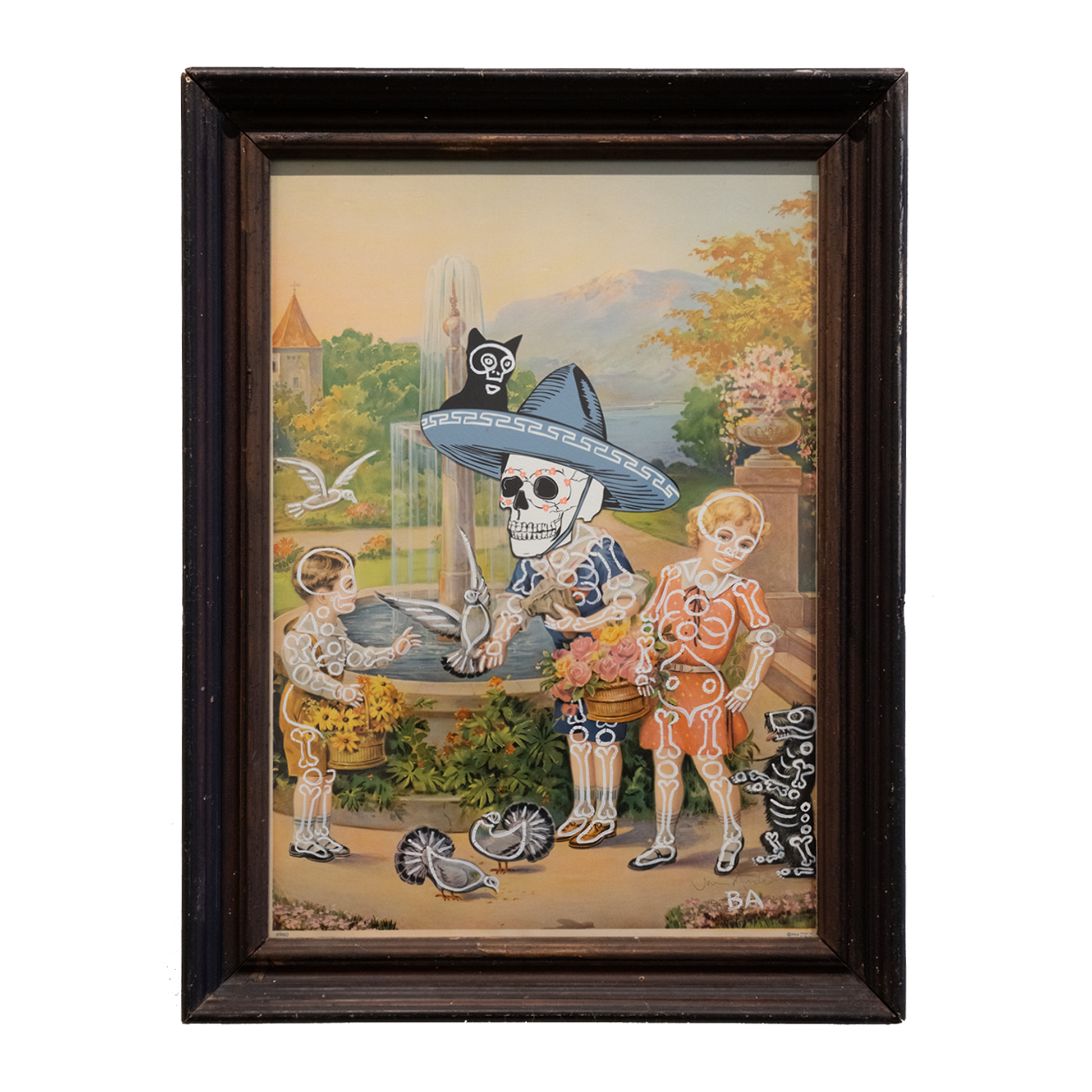 Acrylic and mixed media on vintage offset lithograph with wood framed glass