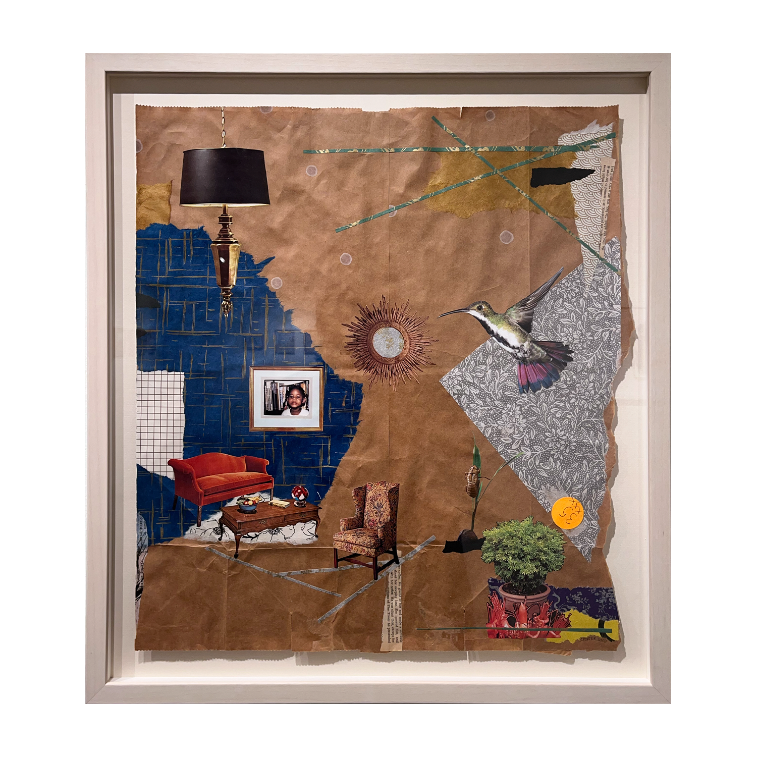 Paper, found images, stickers, portrait of the artist, on recycled brown paper bag