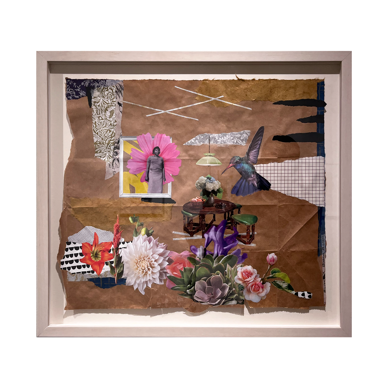 Paper, found images, portrait of the artist’s family member, on recycled brown paper bag