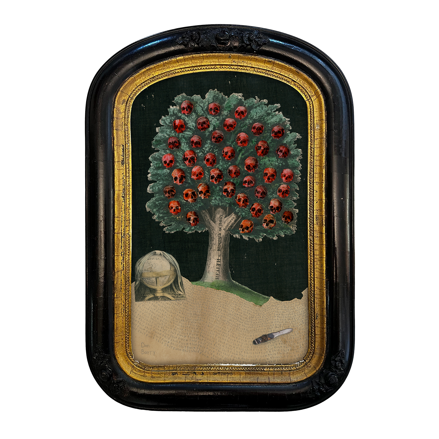 Found paper, graphite, colored pencil, ink, antique frame