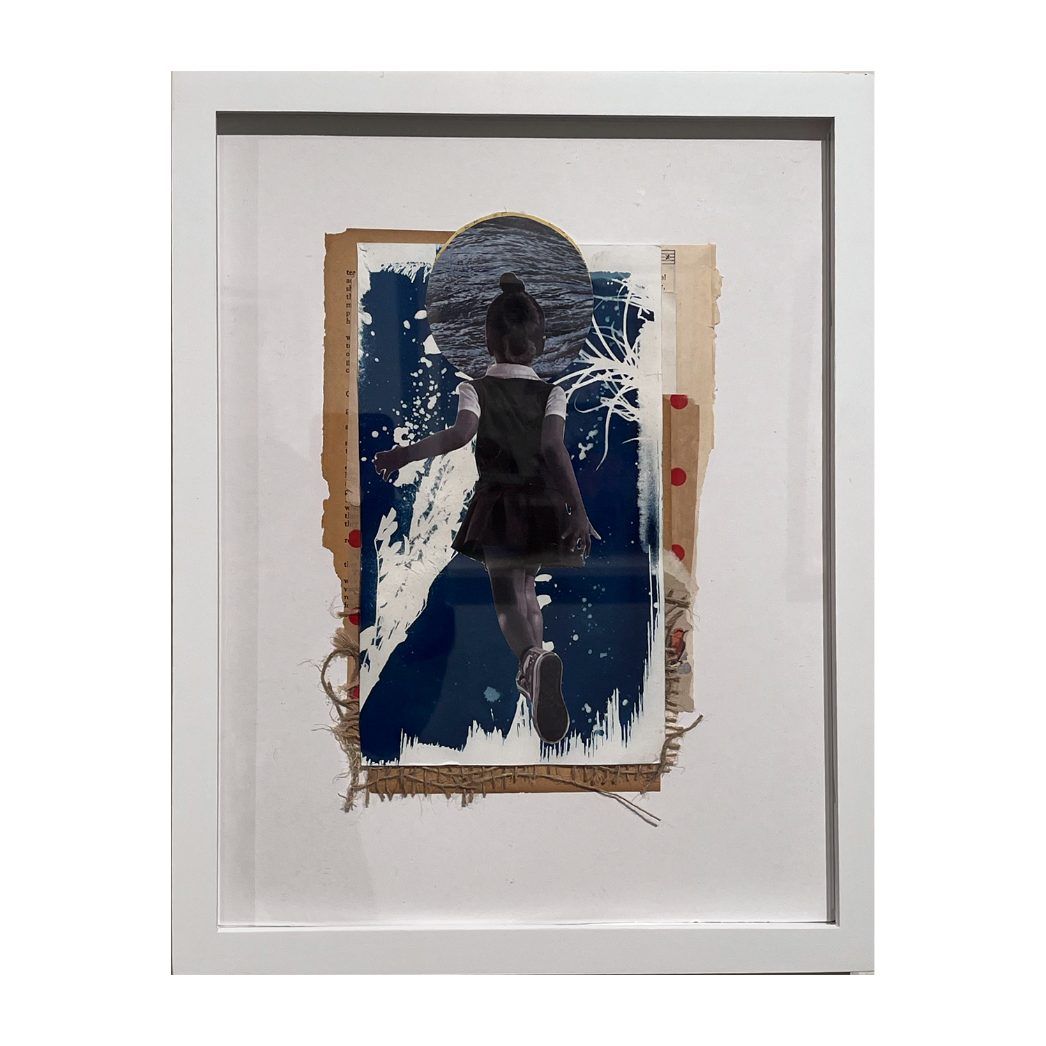 Paper, cyanotype, burlap, acrylic, found image and photography by the artists on acid-free matboard in a frame with acrylic glazing