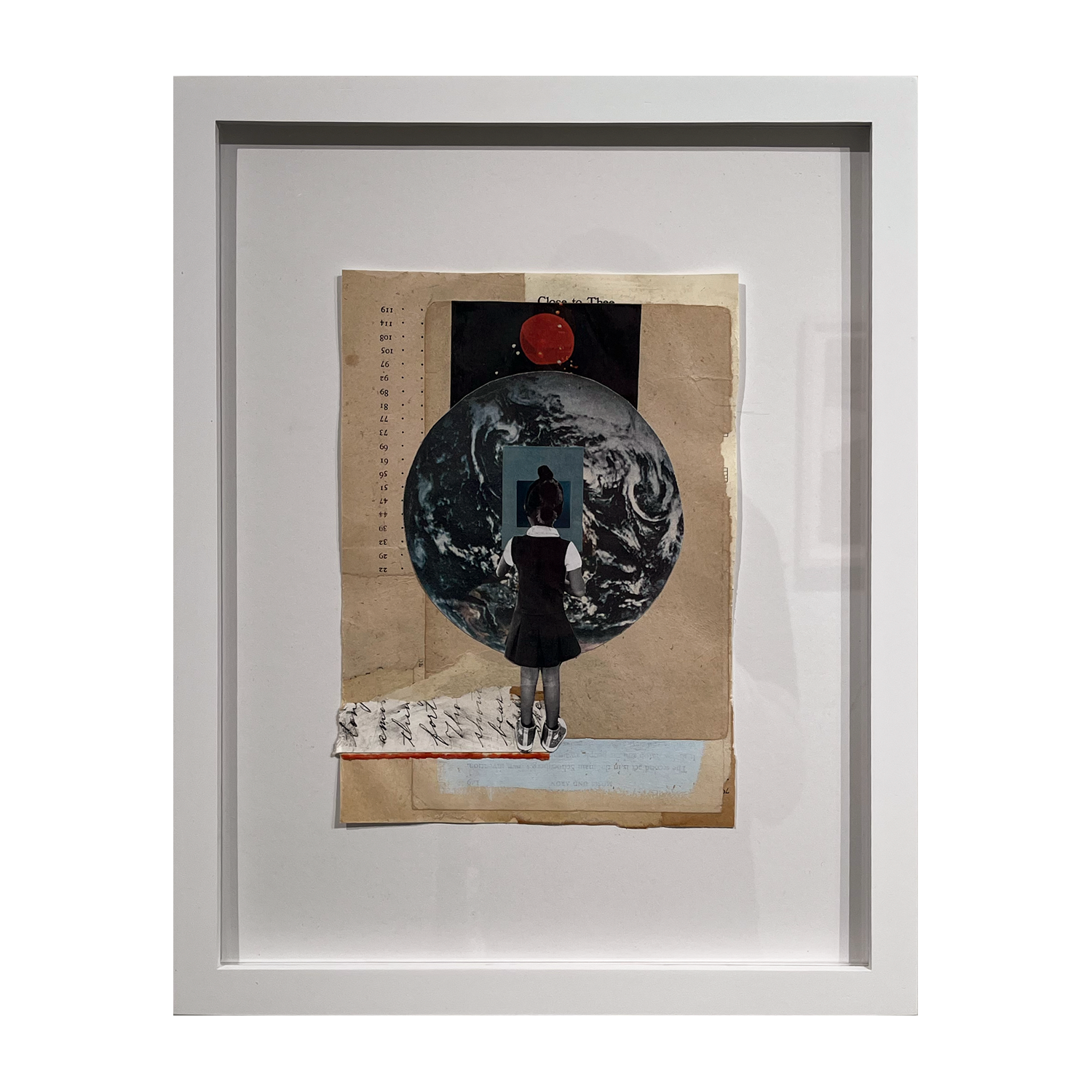 Paper, acrylic, found images, photography by the artist on mixed media paper mounted on acid-free matboard in a frame with acrylic glazing